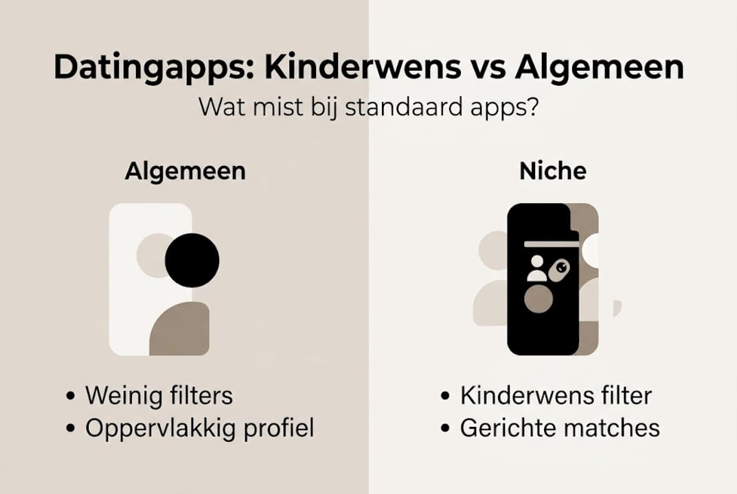 Niche apps bieden precies wat algemene apps missen. Ze stellen de juiste vragen al bij het aanmaken van je profiel. Zo weet je van tevoren of iemand op dezelfde golflengte zit. Serieuze matchmaking op basis van kinderwens werkt fundamenteel anders dan een algoritme dat enkel kijkt naar leeftijd en locatie. Het verschil is niet subtiel. Het is het verschil tussen hopen op een match en weten dat je in de goede richting zoekt.